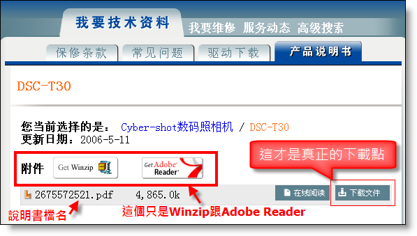 至於 Sony 在對岸官方的下載頁面很也糟,配角比主角還顯眼。我一開始還按了附件的那二個按鈕去下載,才發現那只是 Winzip 跟 Adobe Reader 而已。