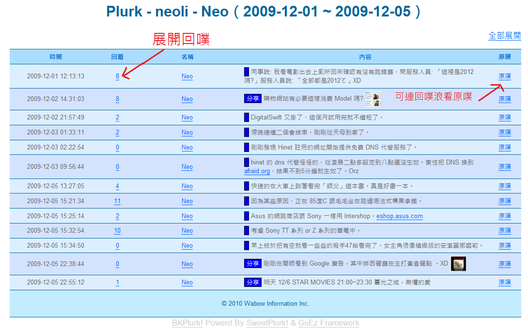 (註:右上角也有一個「全部展開」的功能,但在噗數過多的狀況下瀏覽器會執行很久,或許應該要再加一個「預設全部展開」的選項,不過先等 CSV 匯出的功能出來再說吧)