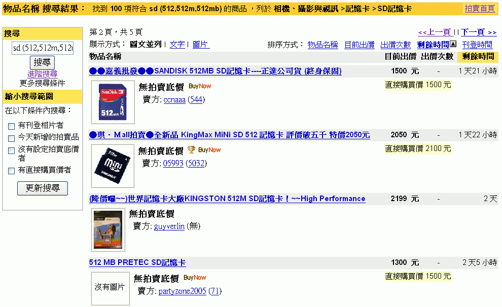 但是很多人不會打那個 B 或 MB,也就是打「SD 512m」或「SD 512」,就完全找不到上述的商品,而且出來的結果完全不一樣。