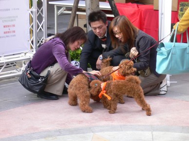 活動是在上星期五舉辦,在到華納威秀之前,已經陸續看到有人帶紅貴賓進場了。真的是爭奇鬥艷呀,幾乎都經過設計造型、毛色也明顯是經過潤絲處理才帶出門。至於行頭完全不輸給人,名牌服飾、珍珠項鍊,甚至還有染髮的貴賓。Orz
